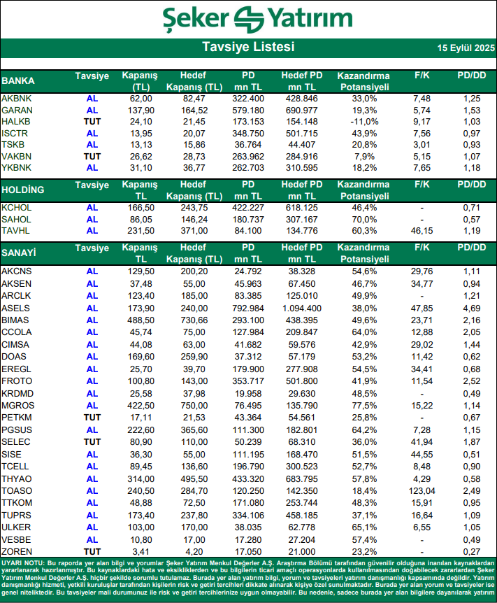 Kaynak: Şeker Yatırım Tavsiye Listesi