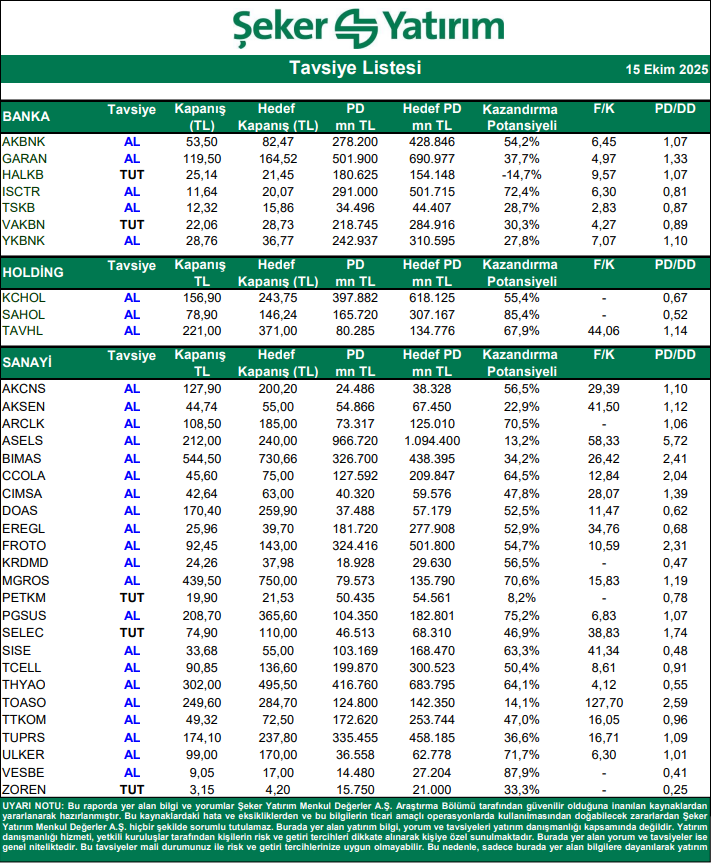 Kaynak: Şeker Yatırım Tavsiye Listesi