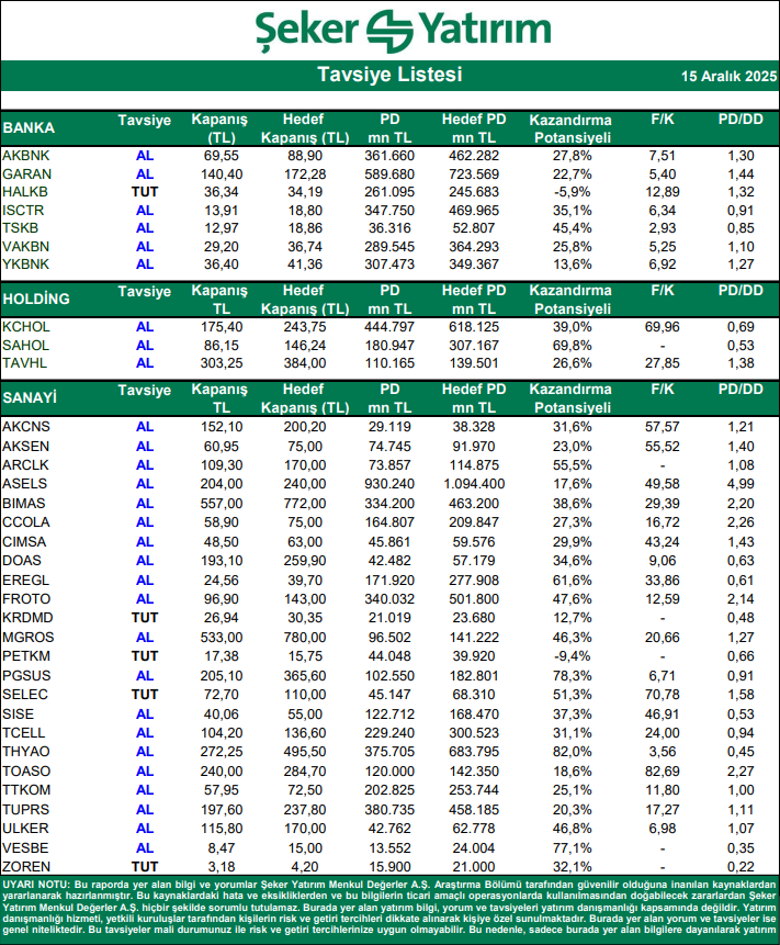 Kaynak: Şeker Yatırım Tavsiye Listesi