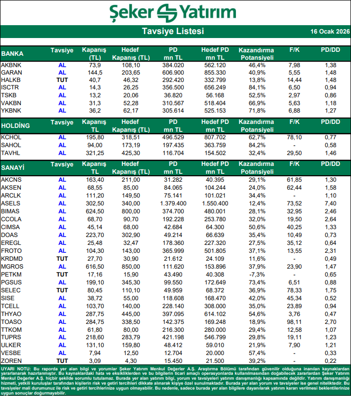 Kaynak: Şeker Yatırım Tavsiye Listesi