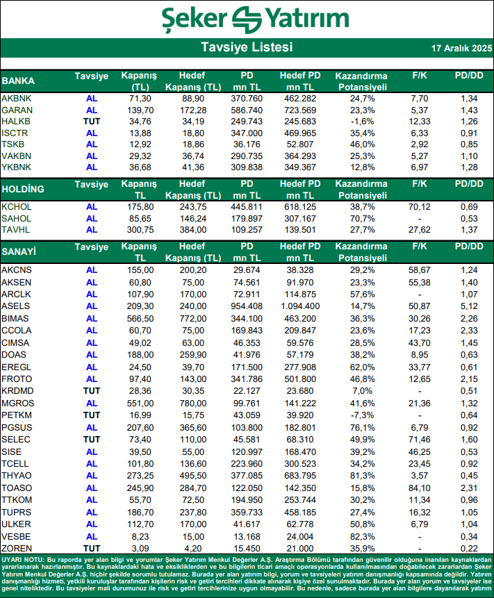 Kaynak: Şeker Yatırım Tavsiye Listesi
