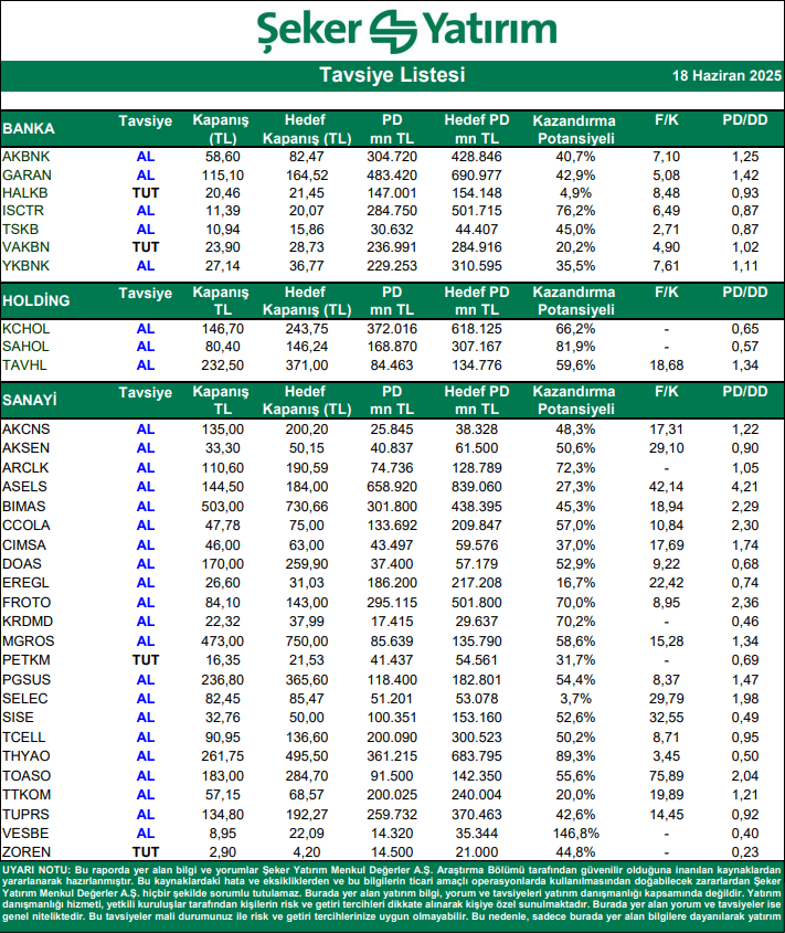 Kaynak: Şeker Yatırım Tavsiye Listesi