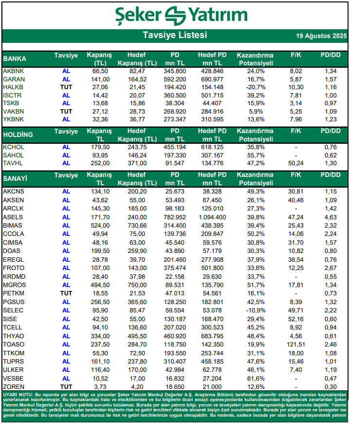 Kaynak: Şeker Yatırım Tavsiye Listesi