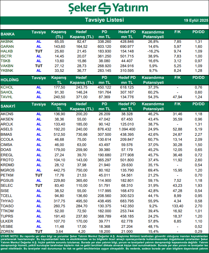 Kaynak: Şeker Yatırım Tavsiye Listesi