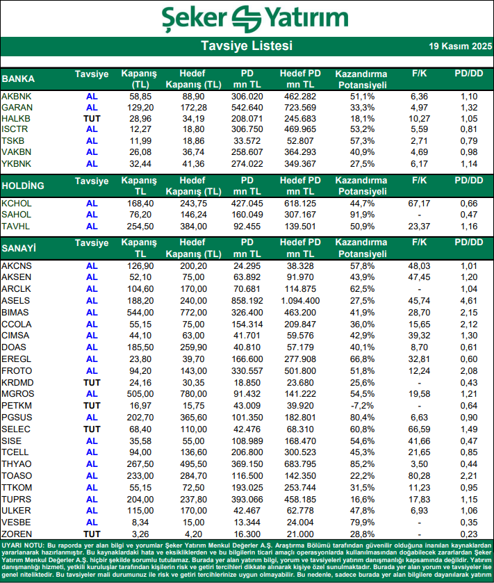 Kaynak: Şeker Yatırım Tavsiye Listesi