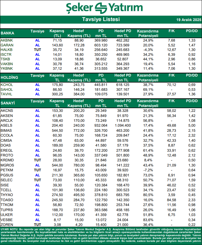 Kaynak: Şeker Yatırım Tavsiye Listesi