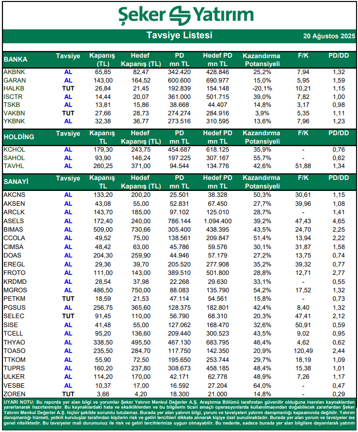 Kaynak: Şeker Yatırım Tavsiye Listesi