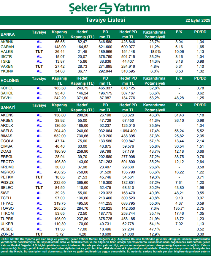 Kaynak: Şeker Yatırım Tavsiye Listesi