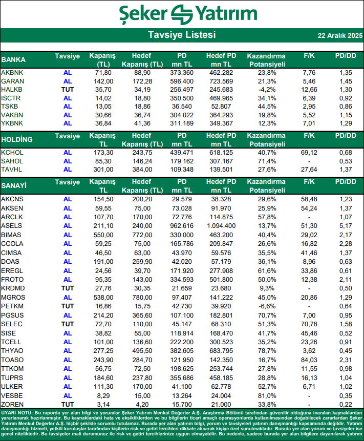 Kaynak: Şeker Yatırım Tavsiye Listesi