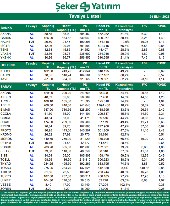 Kaynak: Şeker Yatırım Tavsiye Listesi