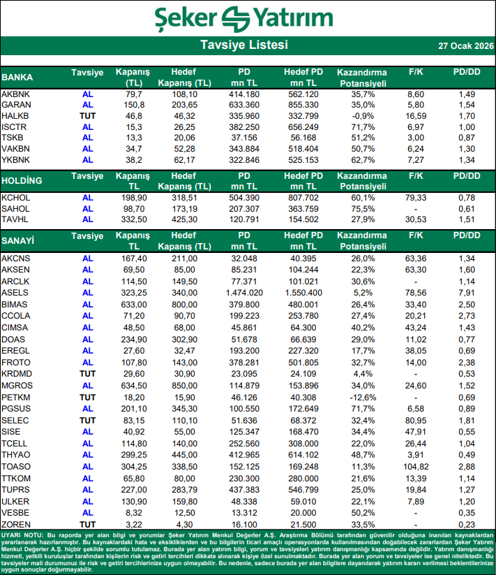 Kaynak: Şeker Yatırım Tavsiye Listesi
