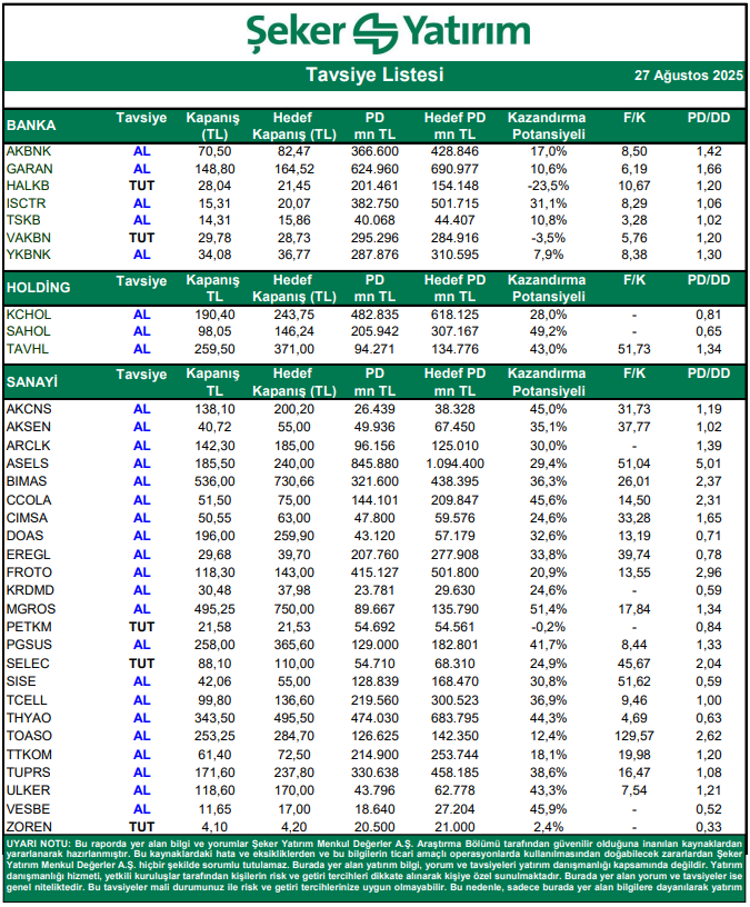 Kaynak: Şeker Yatırım Tavsiye Listesi