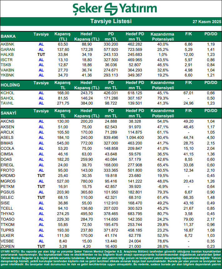 Kaynak: Şeker Yatırım Tavsiye Listesi