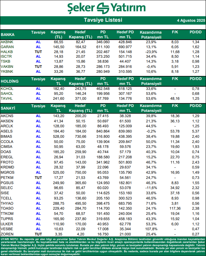 Kaynak: Şeker Yatırım Tavsiye Listesi