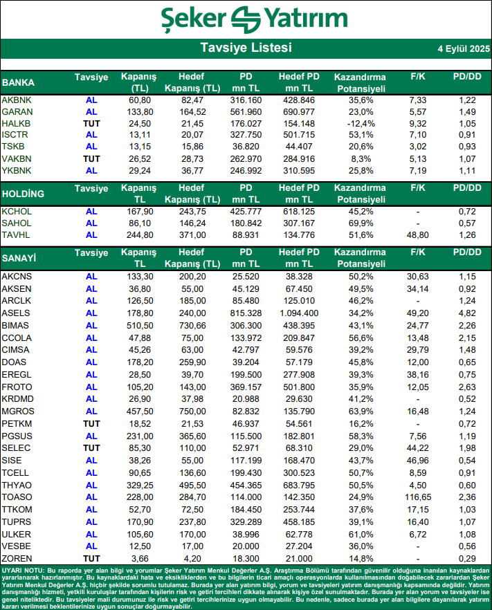 Kaynak: Şeker Yatırım Tavsiye Listesi