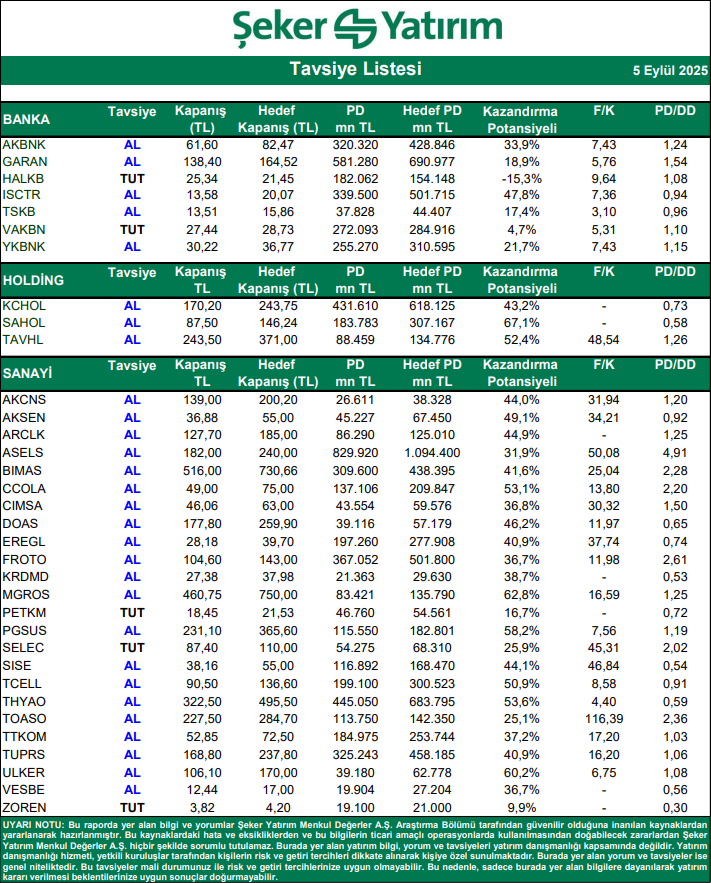 Kaynak: Şeker Yatırım Tavsiye Listesi