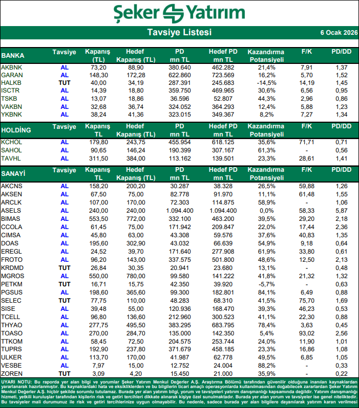 Kaynak: Şeker Yatırım Tavsiye Listesi