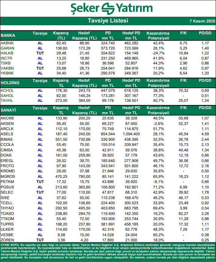 Kaynak: Şeker Yatırım Tavsiye Listesi