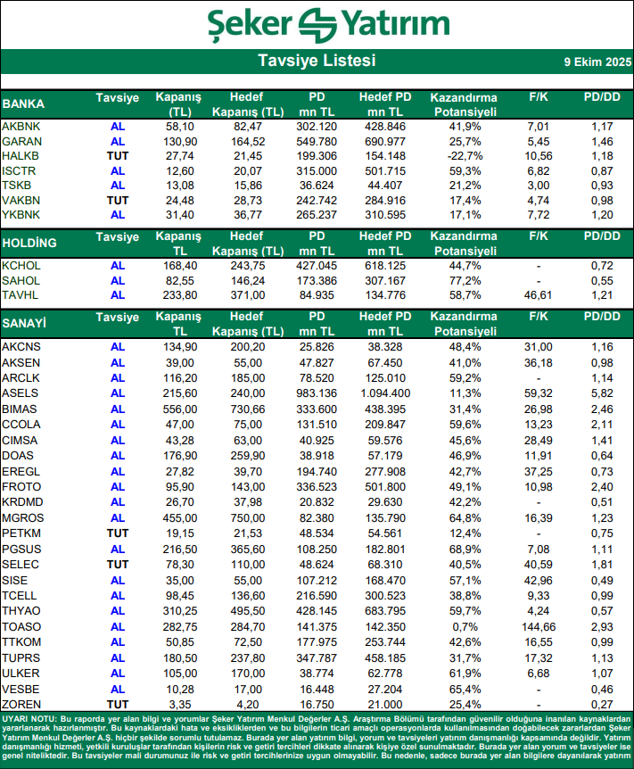 Kaynak: Şeker Yatırım Tavsiye Listesi