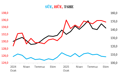 Türkiye’de arz ve talebin seyrini izlemek için üç temel göstergeye bakıyoruz: Sanayi Üretim Endeksi (SÜE), Hizmet Üretim Endeksi (HÜE) ve Ticaret Satış Hacmi Endeksi TSHE). Sanayi ve hizmet üretimi birlikte ekonominin arz yönünün yaklaşık yüzde 85’ini temsil ediyor. Ticaret satış hacmi ise ağırlıklı olarak hane halkı iç talebinin gidişatını gösteriyor.
