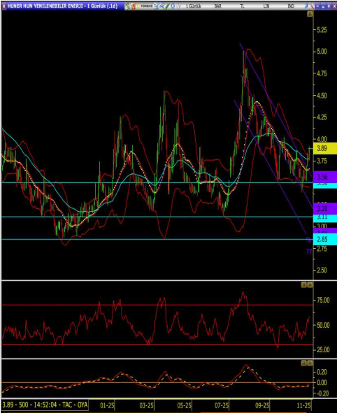 • Bu seviyenin altında hem bollinger orta bant hem de kanalın üst bandına denk gelen 3.66 seviyesine doğru güç kaybı görülebilir.