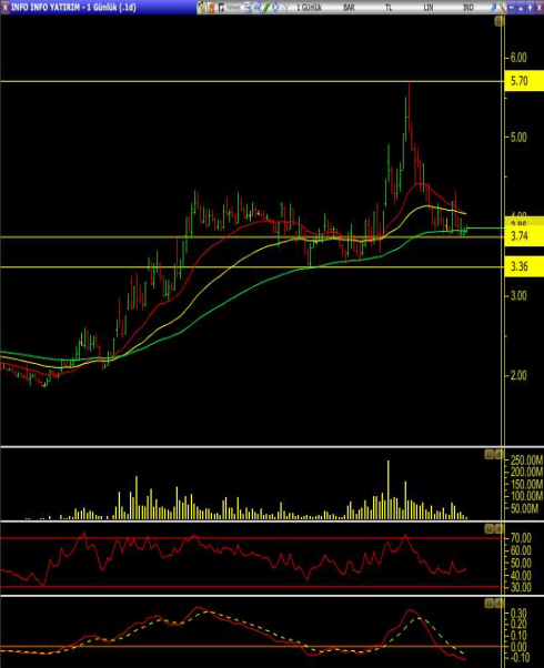 • Hisse, yaklaşık 3,36 – 5,70 TL arasındaki yatay bantta işlem görmüş ve son dönemde 3,74 TL civarında destek bulmuş.