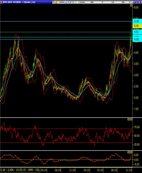 • Bundan kaynaklı 5.38’e doğru yükselişlerde bu seviyenin aşılamaması ve olası kar realizasyonlarının oluşumunda ise bollinger üst banda denk gelen 5.08 destek seviyesinde mevcut pozisyonlar korunabilir.