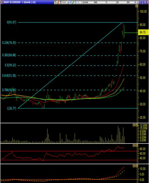 • Fiyat bir süre 40-45 TL bandında yatay hareket ettikten sonra güçlü bir trend başlatmış ancak 91.50 zirvesinden gelen satışlarla 84.15 seviyesine geri çekilme olmuş.