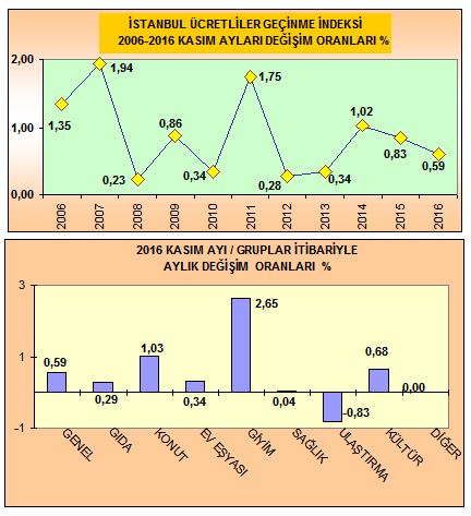 - Perakende fiyatları yansıtan ve 2016 Ekim % 1,21 artış izlenen İstanbul Ücretliler Geçinme İndeksi, 2016 Kasım ayında da % 0,59 oranında artış göstermiştir.