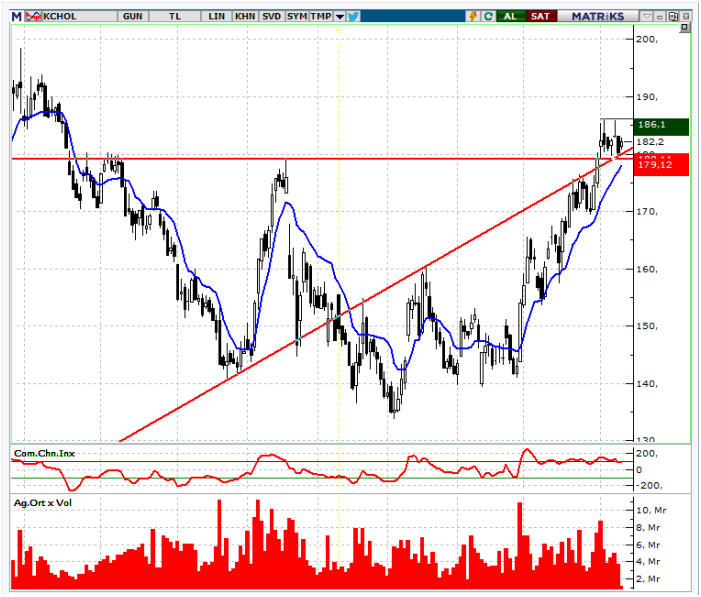 KCHOL pay senedinde 5 günlük değişken hareketli ortalama üzerinde kısa vadeli yükseliş trendi devam etmekte olup, 179,00 seviyesi zarar durdur olarak takip edilmesi kaydıyla 186,10 seviyesinin kısa vadede tekrardan görülebileceğini değerlendiriyoruz.