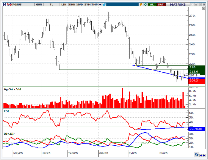 PGSUS pay senedinde günlük grafikte RSI indikatöründeki pozitif uyumsuzluk devam etmekte olup, DI+ indikatöründe toparlanma eğilimi ve DI- indikatöründe kendi destek noktasının aşağısında hareket ettiğini gözlemliyoruz. Son dönemdeki satış baskısının ardından hissede tepki yükselişlerinin görülebileceğini, 23 Haziran 2025 tarihli bardaki günlük en düşük seviye olan 213,60 seviyesine kadar tepki yükselişlerinin görülebileceğini değerlendiriyoruz.
