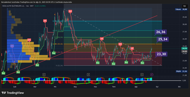 Pivot Fibonacci’ye göre yakın destek seviyeleri 23.85 TL ve 23.58 TL. Yukarı yönde dirençler ise 24.7 TL ve 25.5 TL civarında öne çıkıyor. Bu seviyeler kısa vadede takip edilmesi gereken kritik noktalar. Ultra macd süpertrend yine sönük al verdi. Kısa günlük al/satçılara 25 kuruş için duyrulur.