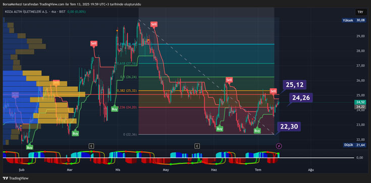 KOZAL (Koza Altın), teknik göstergelere göre günlükte “Al”, hareketli ortalamalara göre ise “Güçlü Al” sinyali vermektedir. Ancak altının yanında amiyane tabirle solda sıfır. 30 TL’den hızla çakıldı ve enflasyona yenildi. RSI (14) 53.5 ile nötr-yükseliş bölgesindedir. Momentum pozitif (1.24), CCI yüksek (83), Stokastik %K 54 – %D 51 ile yükseliş potansiyeline işaret etmektedir. Awesome Oscillator pozitif seyrediyor.