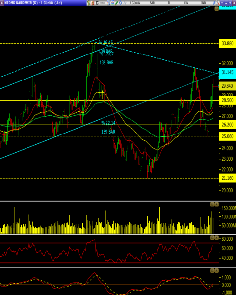 • Ancak hisse 28.50 desteği üzerinde konumunu korur ve tepki alır ve bu seviye üzerinde bir kapanış görülür ise yukarı yönlü hareketin devamından söz edebiliriz.