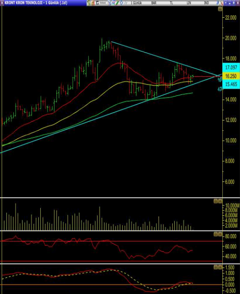 • Hisseye kısa vadeli bakıldığında yükselen trend ile düşen direnç arasında hareketini görüyoruz.