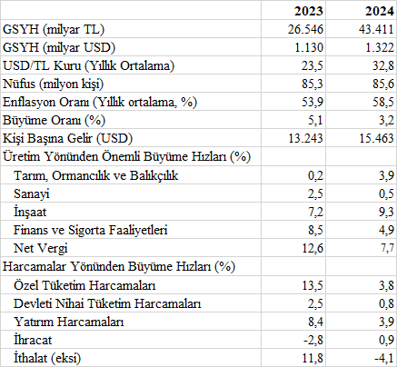 TÜİK, 2024 yılı GSYH’sini, büyüme hızını ve kişi başına gelirini açıkladı. Bunları ve ayrıntılarını geçen yıl verileriyle karşılaştırarak analiz edelim. Önce bir tablo sunalım (tablodaki veriler için kaynak: TÜİK, Dönemsel Gayrisafi Yurt İçi Hasıla, IV. Çeyrek: Ekim-Aralık, 2024 ve TÜİK, Yıllık Gayrisafi Yurt İçi Hasıla, 2023 Bültenleri.)