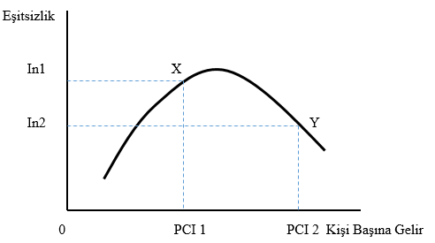 Kuznets Eğrisi Hipotezi açısından eşitsizlik (Inequality – In) gelir dağılımı ölçüsü olarak kullanılan Gini katsayısıyla ölçülür. Gini katsayısı, gelir dağılımı adaletini ölçmekte kullanılan bir katsayıdır. 0 ile 1 arasında değişir. Katsayı sıfıra yaklaştıkça gelir dağılımı adaleti yükselir, 1’e yaklaştıkça eşitlikten uzaklaşır. Yine bu hipotez açısından ekonomik gelişme de kişi başına gelir (per capita income – PCI) düzeyindeki değişimle ölçülür. Hipoteze göre kişi başına gelir arttıkça (şekilde PC1’den PC2’ye ilerledikçe) eşitsizlik azalır (şekilde In1’den In2’ye iniş.) Y noktası, X noktasına göre refahın arttığı ve eşitsizliğin azaldığı bir noktadır.