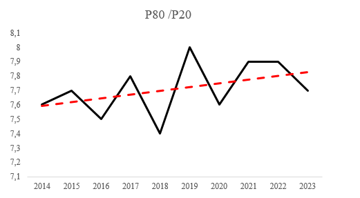 Piketty’nin çalışması ve diğer çalışmalar ekonomilerin geliştikçe gelir dağılımı adaletinin daha da bozulduğunu ve en kötüsü de orta sınıfın giderek zayıfladığını ortaya koyuyor. Bunu biz Türkiye’de somut olarak yaşıyoruz. Son on yılda gelir dağılımındaki gelişmeye bakarsak gelirden en yüksek pay alan yüzde 20 nüfusun (P80) elde ettiği gelirle, en düşük pay alan yüzde 20 nüfusun (P20) elde ettiği pay arasındaki farkın küçülmek bir yana açıldığını görüyoruz (Aşağıdaki grafik TÜİK’in Gelir Dağılımı İstatistiklerindeki veriler kullanılarak tarafımızdan hazırlanmıştır.)