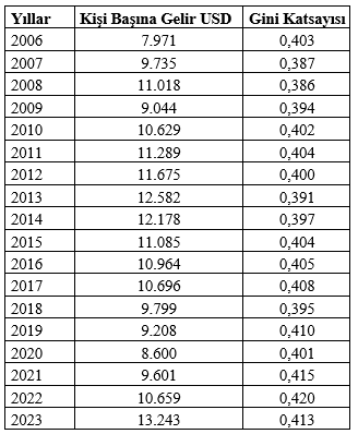 Ek: Türkiye’de Kişi Başına Gelirin ve Gini Katsayısının Gelişimi (Tablodaki veriler için kaynak: TÜİK GSYH hesapları ve TÜİK Gelir Dağılımı İstatistikleri)