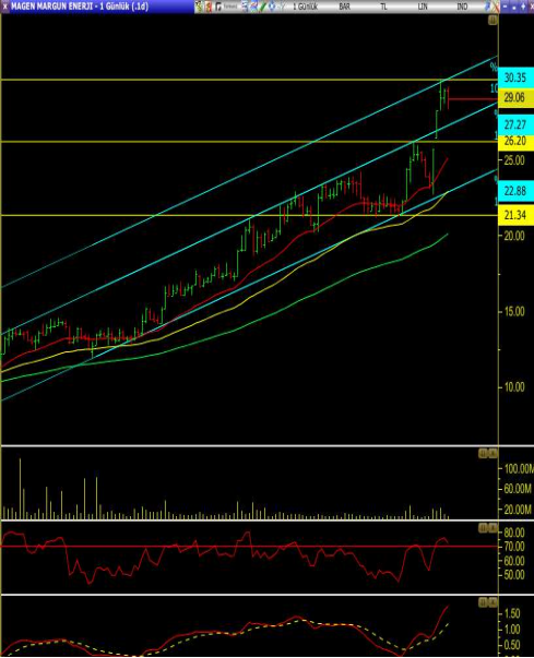 • Yükselen kanal içinde ilerleyen hisse 30.28 seviyesi test etmesi ile birlikte geri çekiliyor.