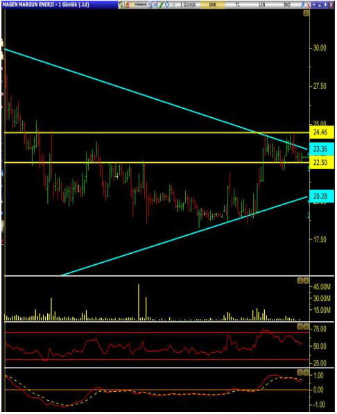 • Ancak yatay bant arasında hareket eden hisse, hacminde artması ile tepki alımları ile karşılaşır ise 23.24 seviyesi ilk direnç olmak üzere sırasıyla 23.82 ve 24.46 seviyeleri hedeflenebilir.