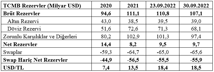 Son yıllara gelinceye kadar TCMB’nin brüt rezervleri de net rezervleri ve fazlaca swap anlaşması olmadığı için swaplar hariç net rezervleri de pozitif düzeydeydi. Son birkaç yıldır TCMB faizleri düşürmeye yönelince kurlar yükselişe geçti, bunu önlemek için bu kez TCMB döviz satarak piyasaya müdahaleye girişti, böylece kur denetlenmeye çalışıldı. Bunların sonucu olarak swaplar hariç rezervler eksiye düştü. 30 Eylül 2022 itibarıyla rezervlerin görünümü şöyledir: