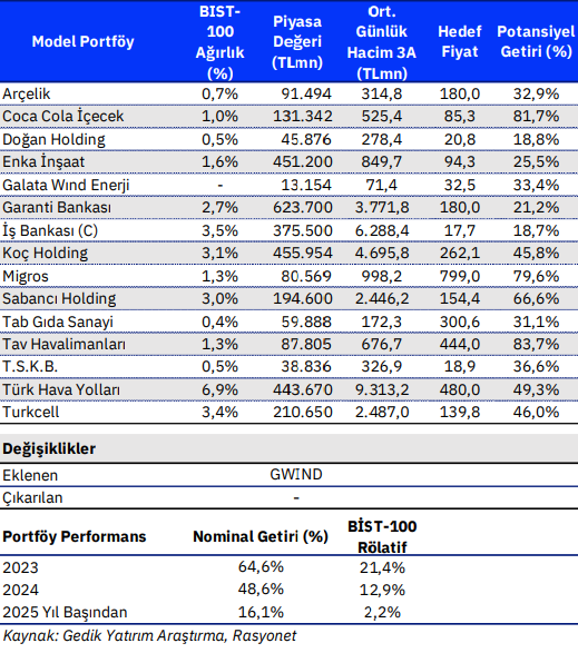 Önemli Not: Gedik Yatırım Model Portföy’ü asgari 7 ve azami 15 adet hisse senedinden oluşur. Ağırlıklar, istisnai durumlar dışında tüm hisseler için %10’dur. Portföyde 10 hissenin altında bulunması durumunda boşluklar BIST-100 ile doldurulur.
