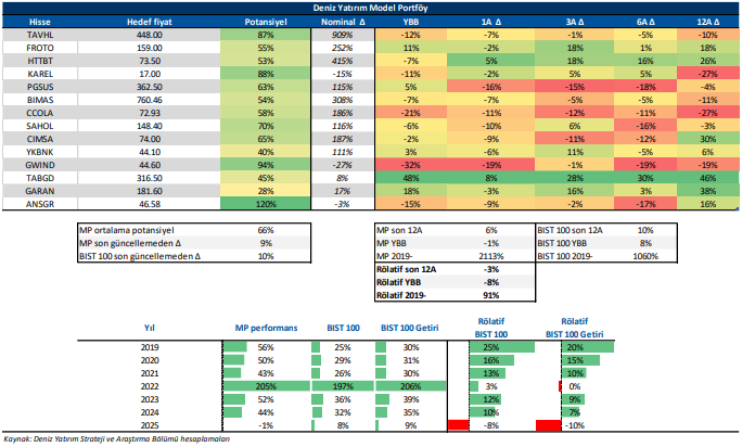 Deniz Yatırım Model Portföy, Deniz Yatırım Strateji ve Araştırma Bölümü tarafından, temel analiz kriterlerine göre hazırlanmış, orta-uzun vadeli hisse senedi tavsiye listesidir. Alınan pozisyonlar sadece uzun yönlüdür (long only). Herhangi bir rakamsal/yüzdesel getiri hedefi söz konusu değildir. Herhangi bir şirket sayısı sınırı söz konusu değildir. Herhangi bir sıklıkta/takvim dahilinde değişiklik yapma zorunluluğu söz konusu değildir. Strateji ve Araştırma Bölümü analistleri portföyü takvim yılı içerisinde piyasa koşulları izin vermez ise değiştirmeme hakkına sahiptirler. Portföy içerisinde yer alan şirketler için temel analiz açısından getiri potansiyeli kalmamış dahi olsa da (değerleme olarak) şirket markasına olan geçmiş ve gelecek dönem güveni ile liste içerisinde kalmaya devam edebilirler. Portföyde yer alan şirketler için AL tavsiyesi bulunması zorunluluğu söz konusu değildir. Bölüm analistleri, TUT ve/veya Gözden Geçiriliyor önerileri ile de liste içerisinde şirket tercihinde bulunabilirler.