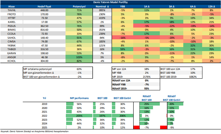 Deniz Yatırım Model Portföy, Deniz Yatırım Strateji ve Araştırma Bölümü tarafından, temel analiz kriterlerine göre hazırlanmış, orta-uzun vadeli hisse senedi tavsiye listesidir. Alınan pozisyonlar sadece uzun yönlüdür (long only). Herhangi bir rakamsal/yüzdesel getiri hedefi söz konusu değildir. Herhangi bir şirket sayısı sınırı söz konusu değildir. Herhangi bir sıklıkta/takvim dahilinde değişiklik yapma zorunluluğu söz konusu değildir. Strateji ve Araştırma Bölümü analistleri portföyü takvim yılı içerisinde piyasa koşulları izin vermez ise değiştirmeme hakkına sahiptirler. Portföy içerisinde yer alan şirketler için temel analiz açısından getiri potansiyeli kalmamış dahi olsa da (değerleme olarak) şirket markasına olan geçmiş ve gelecek dönem güveni ile liste içerisinde kalmaya devam edebilirler. Portföyde yer alan şirketler için AL tavsiyesi bulunması zorunluluğu söz konusu değildir. Bölüm analistleri, TUT ve/veya Gözden Geçiriliyor önerileri ile de liste içerisinde şirket tercihinde bulunabilirler.