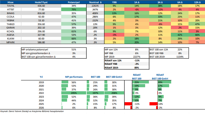 Deniz Yatırım Model Portföy, Deniz Yatırım Strateji ve Araştırma Bölümü tarafından, temel analiz kriterlerine göre hazırlanmış, orta-uzun vadeli hisse senedi tavsiye listesidir. Alınan pozisyonlar sadece uzun yönlüdür (long only). Herhangi bir rakamsal/yüzdesel getiri hedefi söz konusu değildir. Herhangi bir şirket sayısı sınırı söz konusu değildir. Herhangi bir sıklıkta/takvim dahilinde değişiklik yapma zorunluluğu söz konusu değildir. Strateji ve Araştırma Bölümü analistleri portföyü takvim yılı içerisinde piyasa koşulları izin vermez ise değiştirmeme hakkına sahiptirler. Portföy içerisinde yer alan şirketler için temel analiz açısından getiri potansiyeli kalmamış dahi olsa da (değerleme olarak) şirket markasına olan geçmiş ve gelecek dönem güveni ile liste içerisinde kalmaya devam edebilirler. Portföyde yer alan şirketler için AL tavsiyesi bulunması zorunluluğu söz konusu değildir. Bölüm analistleri, TUT ve/veya Gözden Geçiriliyor önerileri ile de liste içerisinde şirket tercihinde bulunabilirler.