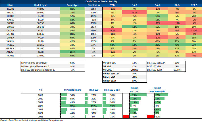 Deniz Yatırım Model Portföy, Deniz Yatırım Strateji ve Araştırma Bölümü tarafından, temel analiz kriterlerine göre hazırlanmış, orta-uzun vadeli hisse senedi tavsiye listesidir. Alınan pozisyonlar sadece uzun yönlüdür (long only). Herhangi bir rakamsal/yüzdesel getiri hedefi söz konusu değildir. Herhangi bir şirket sayısı sınırı söz konusu değildir. Herhangi bir sıklıkta/takvim dahilinde değişiklik yapma zorunluluğu söz konusu değildir. Strateji ve Araştırma Bölümü analistleri portföyü takvim yılı içerisinde piyasa koşulları izin vermez ise değiştirmeme hakkına sahiptirler. Portföy içerisinde yer alan şirketler için temel analiz açısından getiri potansiyeli kalmamış dahi olsa da (değerleme olarak) şirket markasına olan geçmiş ve gelecek dönem güveni ile liste içerisinde kalmaya devam edebilirler. Portföyde yer alan şirketler için AL tavsiyesi bulunması zorunluluğu söz konusu değildir. Bölüm analistleri, TUT ve/veya Gözden Geçiriliyor önerileri ile de liste içerisinde şirket tercihinde bulunabilirler.