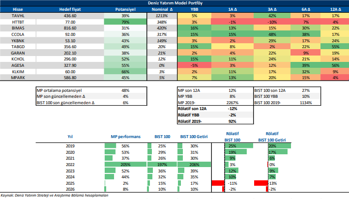 Deniz Yatırım Model Portföy, Deniz Yatırım Strateji ve Araştırma Bölümü tarafından, temel analiz kriterlerine göre hazırlanmış, orta-uzun vadeli hisse senedi tavsiye listesidir. Alınan pozisyonlar sadece uzun yönlüdür (long only). Herhangi bir rakamsal/yüzdesel getiri hedefi söz konusu değildir. Herhangi bir şirket sayısı sınırı söz konusu değildir. Herhangi bir sıklıkta/takvim dahilinde değişiklik yapma zorunluluğu söz konusu değildir. Strateji ve Araştırma Bölümü analistleri portföyü takvim yılı içerisinde piyasa koşulları izin vermez ise değiştirmeme hakkına sahiptirler. Portföy içerisinde yer alan şirketler için temel analiz açısından getiri potansiyeli kalmamış dahi olsa da (değerleme olarak) şirket markasına olan geçmiş ve gelecek dönem güveni ile liste içerisinde kalmaya devam edebilirler. Portföyde yer alan şirketler için AL tavsiyesi bulunması zorunluluğu söz konusu değildir. Bölüm analistleri, TUT ve/veya Gözden Geçiriliyor önerileri ile de liste içerisinde şirket tercihinde bulunabilirler.
