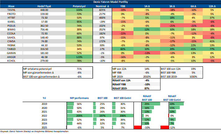 Deniz Yatırım Model Portföy, Deniz Yatırım Strateji ve Araştırma Bölümü tarafından, temel analiz kriterlerine göre hazırlanmış, orta-uzun vadeli hisse senedi tavsiye listesidir. Alınan pozisyonlar sadece uzun yönlüdür (long only). Herhangi bir rakamsal/yüzdesel getiri hedefi söz konusu değildir. Herhangi bir şirket sayısı sınırı söz konusu değildir. Herhangi bir sıklıkta/takvim dahilinde değişiklik yapma zorunluluğu söz konusu değildir. Strateji ve Araştırma Bölümü analistleri portföyü takvim yılı içerisinde piyasa koşulları izin vermez ise değiştirmeme hakkına sahiptirler. Portföy içerisinde yer alan şirketler için temel analiz açısından getiri potansiyeli kalmamış dahi olsa da (değerleme olarak) şirket markasına olan geçmiş ve gelecek dönem güveni ile liste içerisinde kalmaya devam edebilirler. Portföyde yer alan şirketler için AL tavsiyesi bulunması zorunluluğu söz konusu değildir. Bölüm analistleri, TUT ve/veya Gözden Geçiriliyor önerileri ile de liste içerisinde şirket tercihinde bulunabilirler.