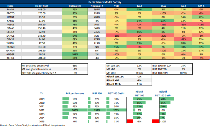Deniz Yatırım Model Portföy, Deniz Yatırım Strateji ve Araştırma Bölümü tarafından, temel analiz kriterlerine göre hazırlanmış, orta-uzun vadeli hisse senedi tavsiye listesidir. Alınan pozisyonlar sadece uzun yönlüdür (long only). Herhangi bir rakamsal/yüzdesel getiri hedefi söz konusu değildir. Herhangi bir şirket sayısı sınırı söz konusu değildir. Herhangi bir sıklıkta/takvim dahilinde değişiklik yapma zorunluluğu söz konusu değildir. Strateji ve Araştırma Bölümü analistleri portföyü takvim yılı içerisinde piyasa koşulları izin vermez ise değiştirmeme hakkına sahiptirler. Portföy içerisinde yer alan şirketler için temel analiz açısından getiri potansiyeli kalmamış dahi olsa da (değerleme olarak) şirket markasına olan geçmiş ve gelecek dönem güveni ile liste içerisinde kalmaya devam edebilirler. Portföyde yer alan şirketler için AL tavsiyesi bulunması zorunluluğu söz konusu değildir. Bölüm analistleri, TUT ve/veya Gözden Geçiriliyor önerileri ile de liste içerisinde şirket tercihinde bulunabilirler.